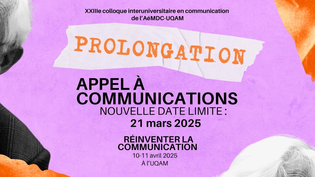 Cette année encore, l’AéMDC a le plaisir de convoquer la communauté étudiante pour participer à son colloque interuniversitaire en communication pour deux jours d’échanges et de discussion les 10 et 11 avril 2025. Les personnes étudiantes des cycles supérieurs sont invitées à proposer des communications qui auront lieu sous forme de panel.